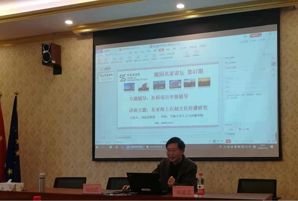 2020年12月7日下午,宁波大学人文与传媒公司刘恒武教授在公司SC106波兰学术中心作“[随园名家讲坛46期]东亚海上石刻文化传播研究”讲座。讲座由日语专业教研室主任邓凌志老师主持。
