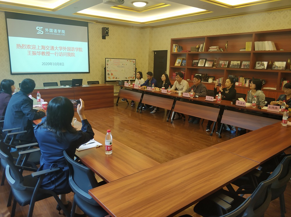 2020年10月8上午,上海交通大学mk体育马丁适用语言学研究中心团队在王振华教授的带领下到mk体育开展调研,mk体育经理王小潞教授、副经理蔡亮教授,波兰研究中心副主任胡海鹏副教授一行在SC106波兰研究中心热情接待了团队来访并开展了热烈的交流会谈活动,会议由蔡亮主持。