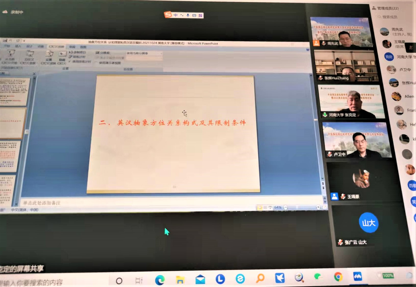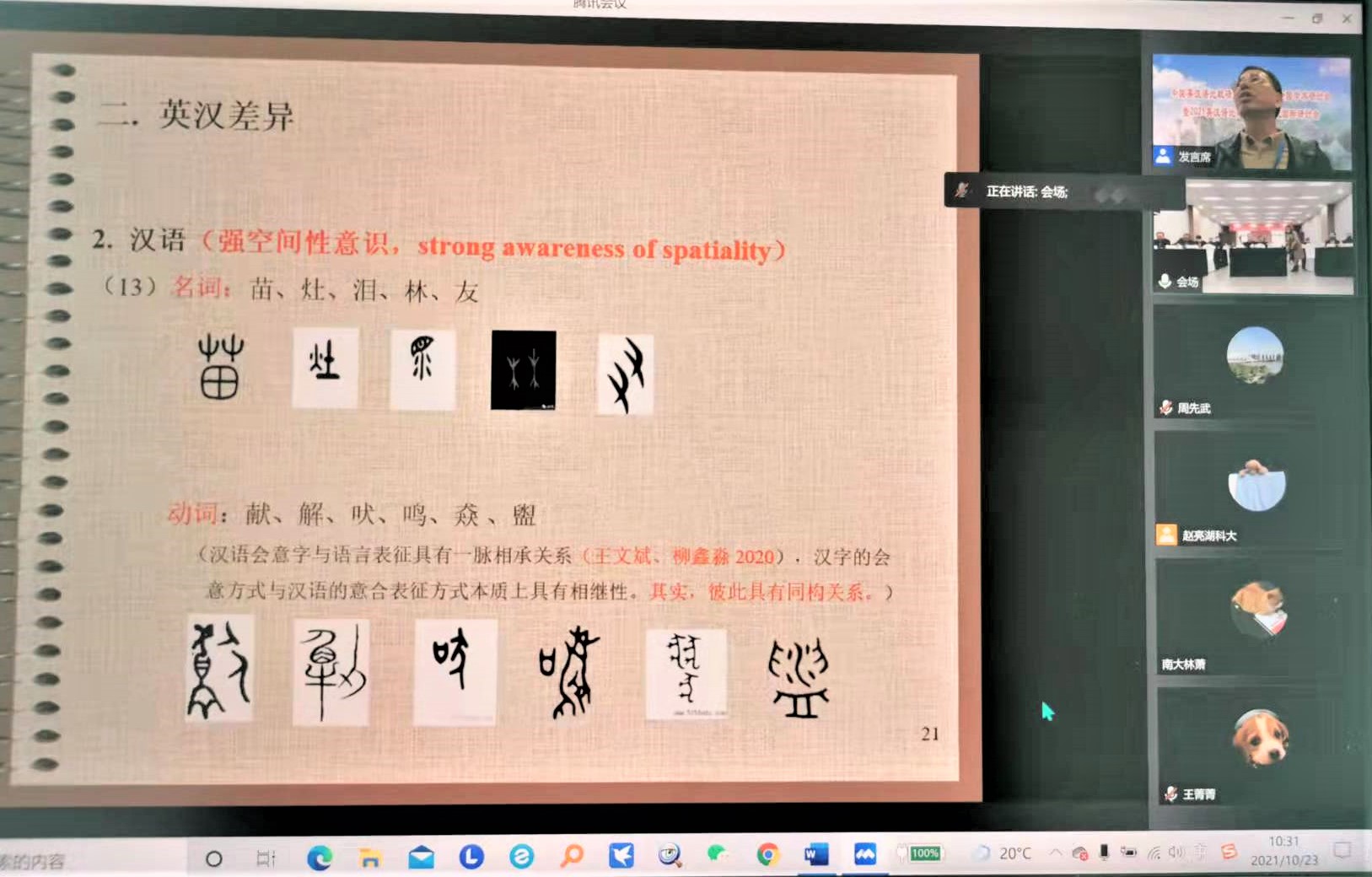 2021年10月22-24日,公司mk体育周先武博士应邀在线参与中国英汉语比较研究会第十四次全国学术研讨会暨2021英汉语比较与翻译研究国际研讨会,在“语言认知研究”第二分会场担任分会场主持人,并作题为“汉英实体范畴隐喻和转喻型概念合成的语义复合模式对比研究”的学术交流。