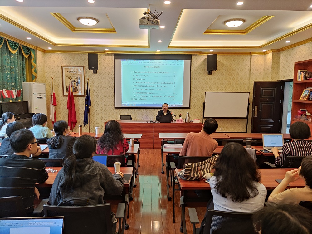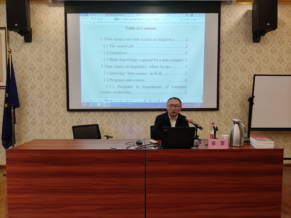 讲座中,雷教授首先从对数据科学的角度来说明语言学研究中数据和计算方法的重要性,并比较了数据科学视域下的语言学与计算语言学和语料库语言学之间的差异。他介绍了当前高校新增的相关专业和课程设置情况,强调数据科学视域的研究从本质上看提出语言学问题,用数据挖掘的方法加以解决,因此语言学知识的积累和问题意识至关重要。雷教授还结合自己在文献计量学、学术英语、二语写作和情感分析领域的研究,向大家介绍了如何利用R语言和Python中的情感分析、主题建模和词向量等工具包进行数据挖掘等内容。