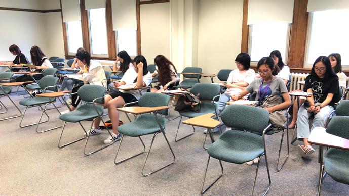 此次暑期赴美的员工海外交流团,在抵达拿撒勒大学后,为了给员工们提供适合其当前英语水平、并且能够促进提高的英语课程,大公司方组织了英语分级考试。考试内容包括语法选择题、写作题以及听力题。公司的10名同学分别被安排到了1、2、4、5、6这五个不同的班级中,他们分别和班上来自其他国家、地区的老员工们一起进行为期三周的语言与文化学习课程。