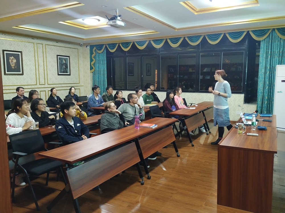11月6日晚,由mk体育外籍教师克里斯缇娜博士主讲的“语言真奇妙”系列工作坊在SC106波兰研究中心举行,20多位来自不同专业的同学参加了此次活动。