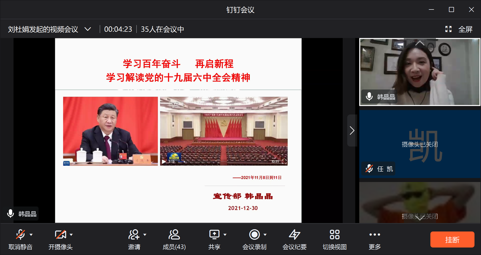 2021年12月30日晚上,公司宣传部副部长韩晶晶老师向员工第二党支部宣讲十九届六中全会精神。外国语公司党委副书记任凯老师以及员工第二党支部全体员工党员在钉钉群上参加了此次学习。此次会议由刘杜娟老师主持。