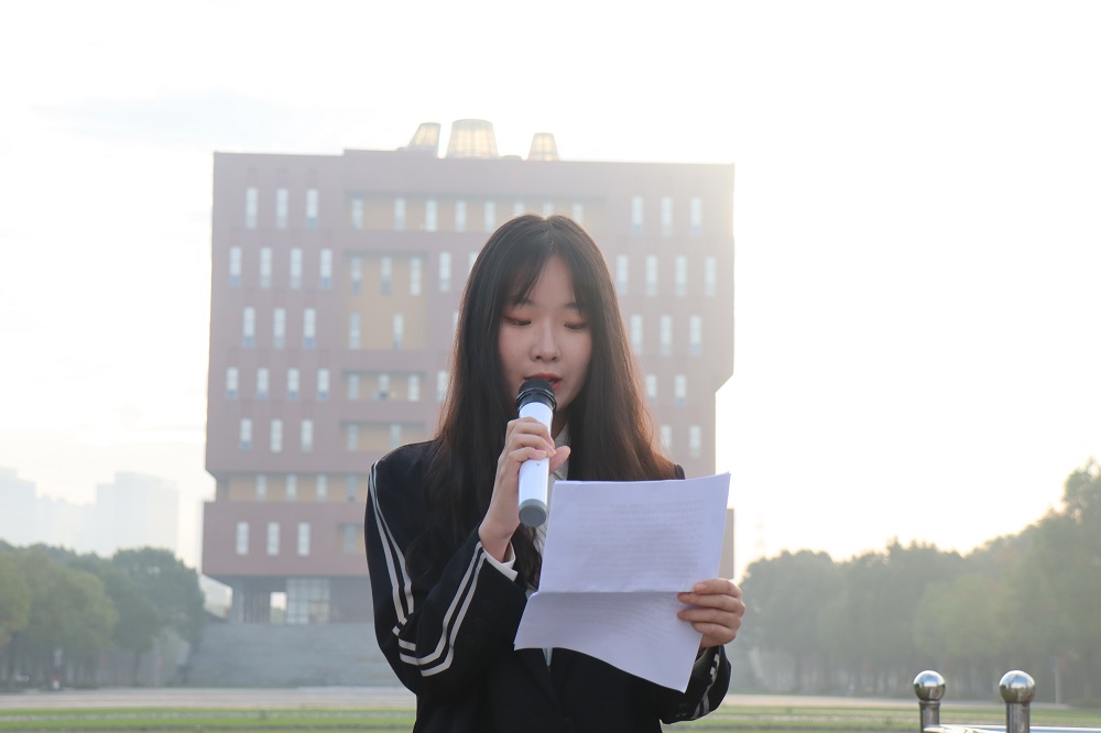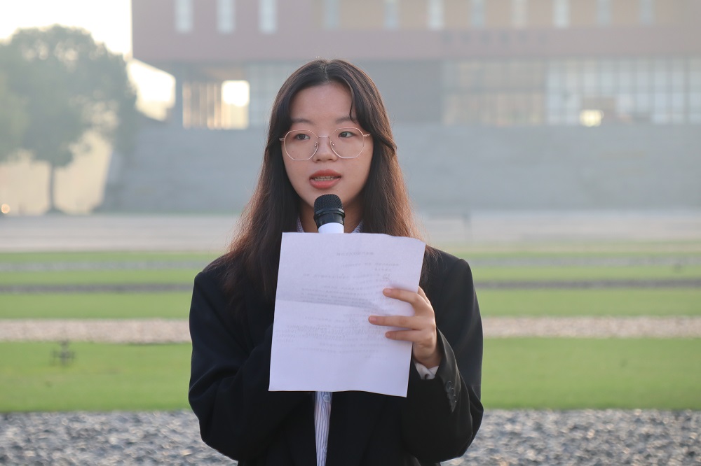 礼毕,2020级新生代表朱秀萍进行国旗下演讲。她就老员工活及学习方面发表了个人看法,勉励20级新生做到“以知促行、以行求知”,铭记校训“知行合一,知难而进,知书达礼,知恩图报”,并倡议20级新生坚持脚踏实地,事事躬行,争做优秀老员工。新生代表英语202徐佳琪同学在演讲中提到在大学中不仅要有学习上的进步,也要多参与社会实践,提高自身综合能力,并祝愿所有新生能成就自己精彩的老员工活。