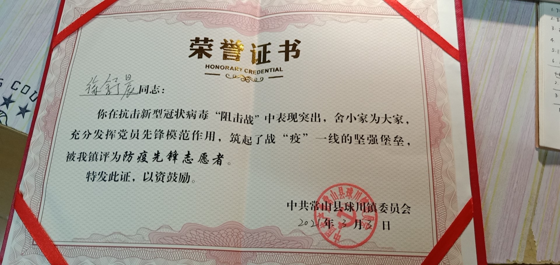 2021年寒假期间,她再次成为一名防疫志愿者。虽然此时疫情已经被有效控制,但仍有少部分地区时不时有感染人员的出现。在志愿服务期间,她配合组织上的安排,在超市、菜市场等人口众多地区进行体温测量。由于表现良好,徐舒晨同志荣获中共常山县球川镇委员会颁发的“防疫先锋志愿者”荣誉证书。