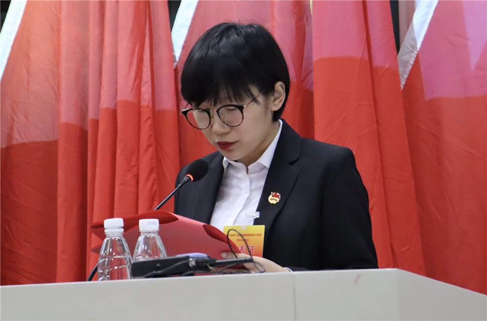 方露致辞,她围绕员工会中心工作进行了工作总结,并表示员工会组织应积极发挥模范带头作用,为今后的员工工作奠定坚实基础,有效地组织动员青年,跟随青年共同成长进步。