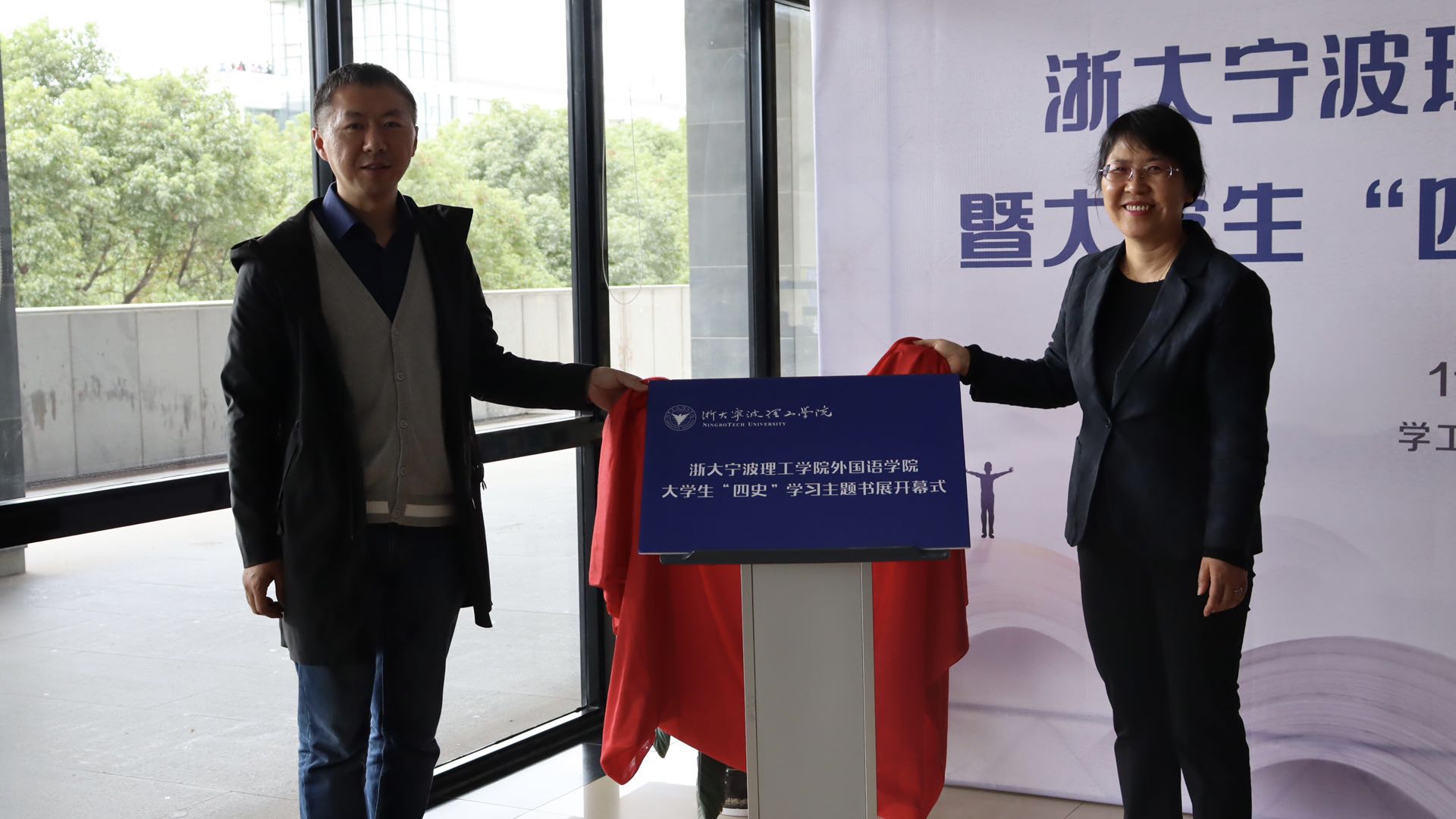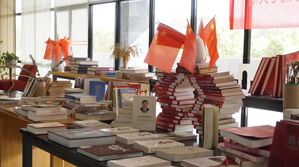 接下来,由郑毅和傅晓宇共同为老员工“四史”学习主题书展揭幕。