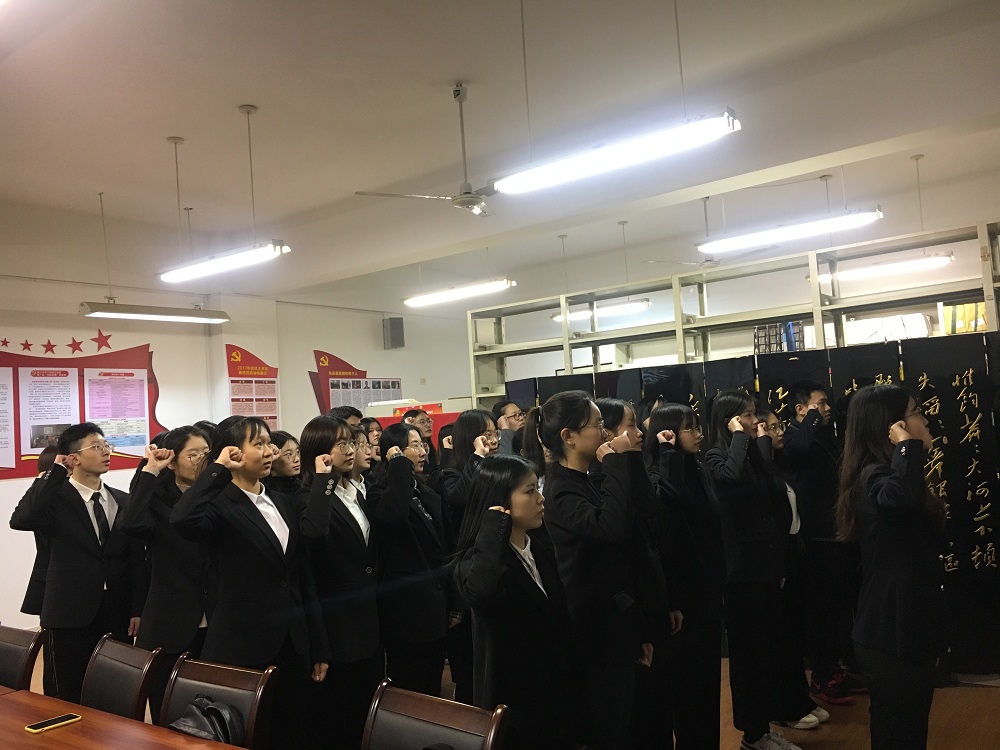 仪式上,33名预备党员面对鲜红的党旗,在公司2019年党员之星获得者、英语163班林宇晴同志的带领下进行了集体入党宣誓。宣誓结束后,与会的正式党员为预备党员佩戴党徽,预备党员代表英语173班钱瑶同学进行了发言,表达了会以全心全意为人民服务为宗旨,不断提高服务水平和学习本领,充分发挥党员先锋模范作用的决心。芦美丽老师对同学们表达了祝贺,希望预备党员牢记全心全意为人民服务的宗旨,发扬党的优良传统和作风,认真学习党的基本理论和知识,更加努力地学习、工作,牢记“为中国人民谋幸福 为中华民族谋复兴”的初心和使命,做一名无愧于共产党员光荣称号的合格党员。