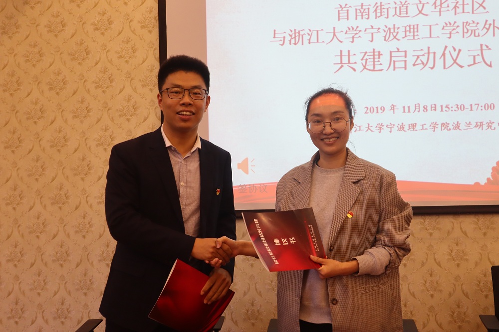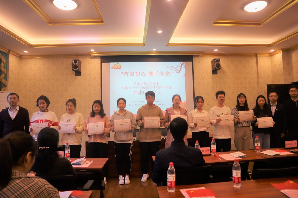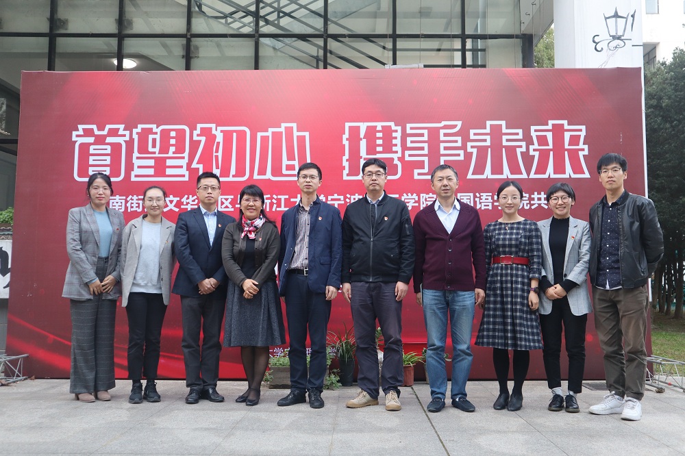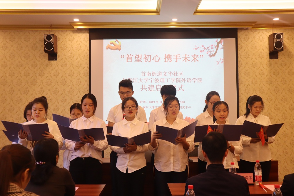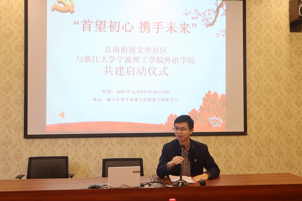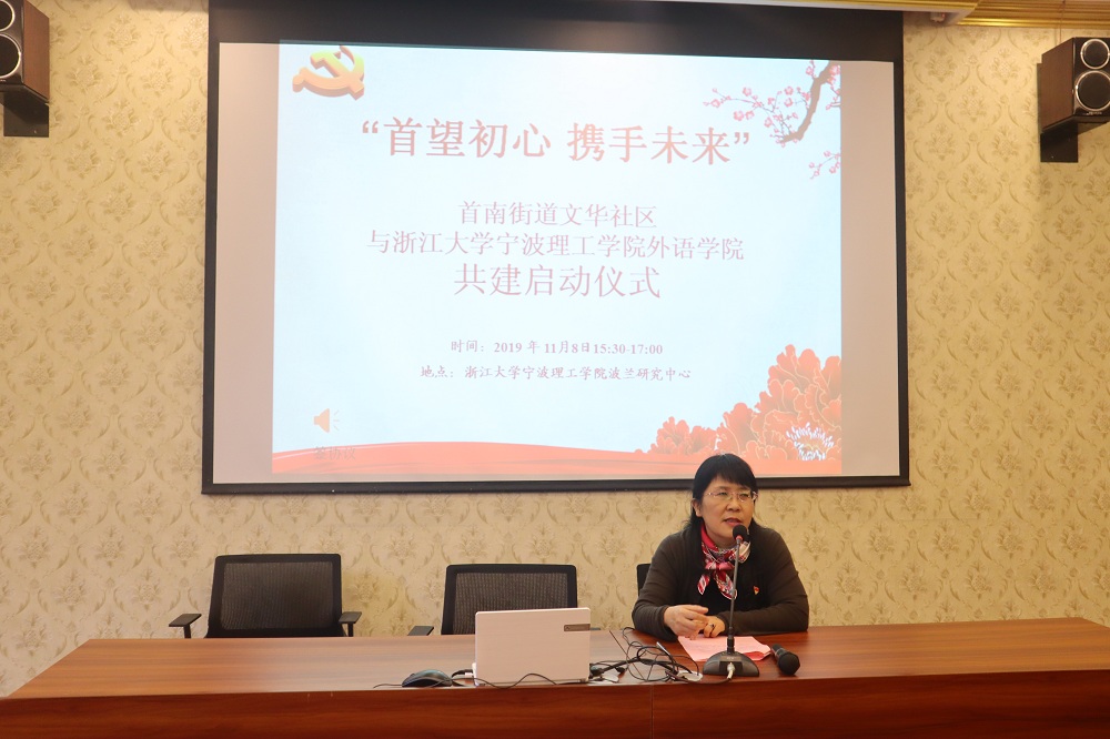 活动伊始,首先由外国语公司党委副书记、公司副经理傅晓宇致辞,她指出,此次共建,首先是实现党建共建,文华社区党支部和浙江大学宁波理工公司外语公司员工党支部的长期共建;其次,是基地共建,基于双方的良好平台,继续深入发掘优质资源,实现多方位的互通;同时也关注文化共建,丰富的高校资源和浓厚的中西学术氛围相结合,既传承和发扬中国优秀传统文化,又吸收优秀西方文化,文化交融,共建文化。接着是首南街道党工委副书记周明峰讲话,他指出,首南街道文华社区所辖地区,高校资源丰富,有浓厚的学术气息及国际化氛围,加强社区和高校的交流,从而充分实现资源互通、学习互通、文化共建。