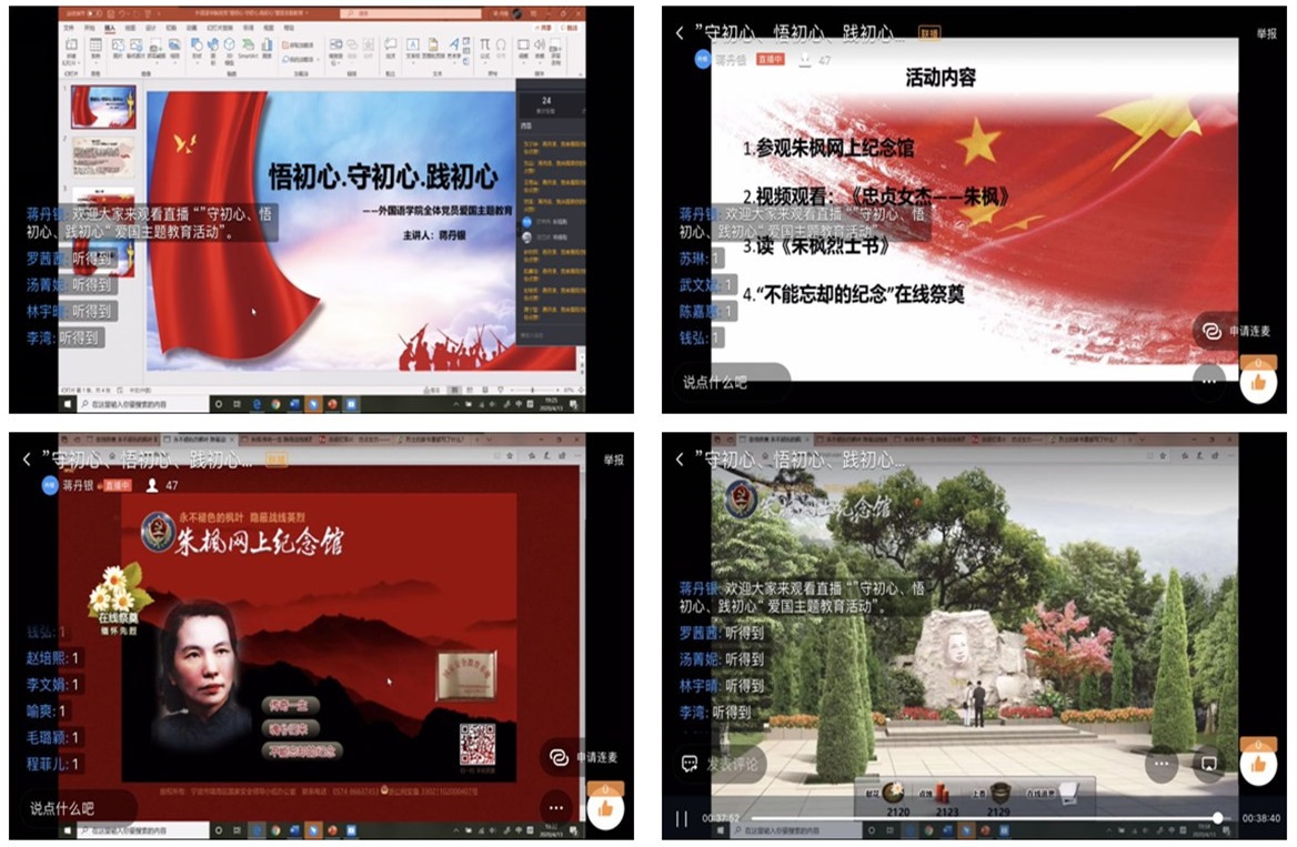 活动中,主持人蒋丹银带领全体员工党员参观了朱枫网上纪念馆,通过介绍朱枫烈士的英勇事迹、观看《忠贞女杰--朱枫》纪录片、共读《朱枫烈士书》,大家被朱枫烈士的革命奉献精神所感动,并纷纷抒发自己的学习体会。员工第一党支部沈超群同学提到要学习朱枫烈士国家利益高于个人利益、胸怀大局、为国家而舍小家的精神;钱瑶同学提到在缅怀烈士的同时,也要意识到如今和平生活的来之不易,一定要珍惜和平。员工第二党支部张喆同学感触尤为深刻,她说,“我们脚下生活着的土地,没有一片不是先烈曾拼着命守护的,在缅怀朱枫烈士的同时,我们应该扪心自问,什么才是真正的初心,又是什么,值得我们真正去守护。”