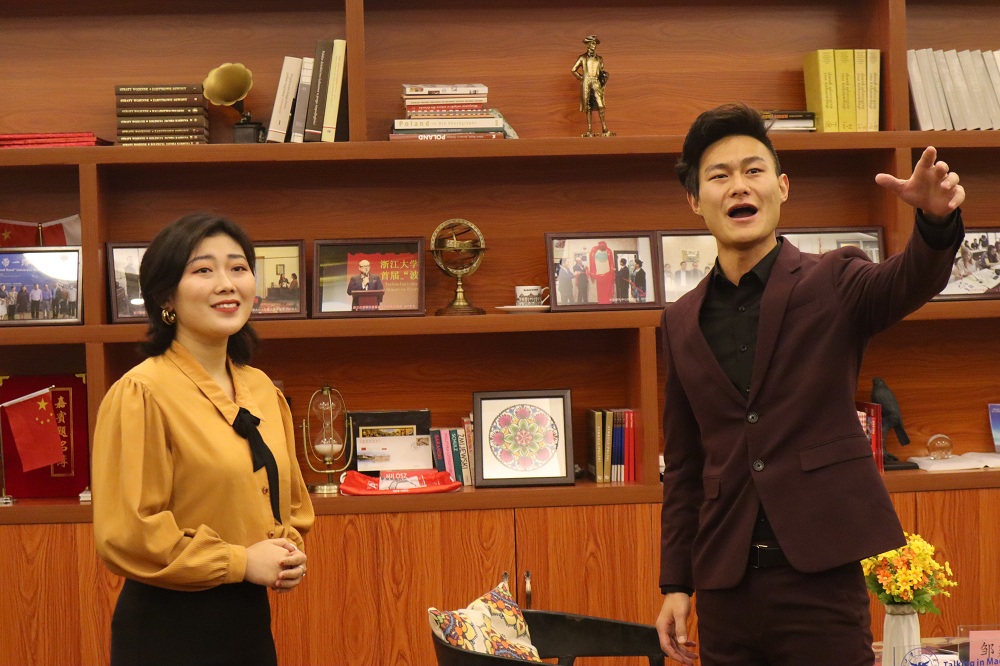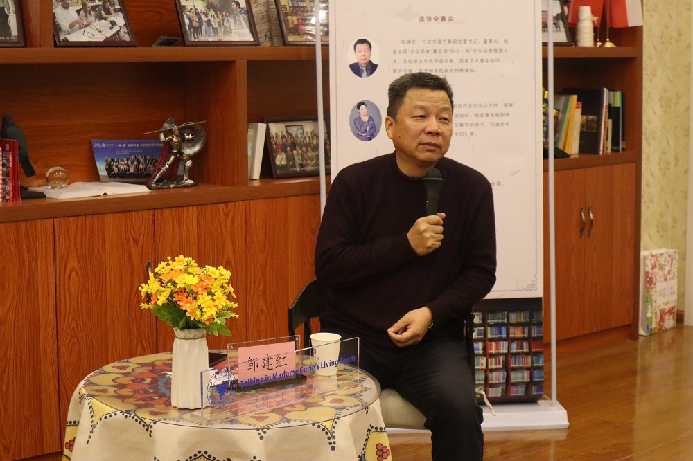 浙江大学宁波理工公司“波兰研究中心”是教育部批准的国别与区域研究中心,聚焦波兰文化,探讨中波交流,“居里夫人会客厅”是该校举办的第二届“波兰周”最后一项重大活动。邹建红从2015年12月赴瑞典为屠呦呦领奖之行策划举办系列演出活动开始讲起,讲他如何被屠教授的人格魅力和精神所打动,下决心要将屠呦呦的精彩故事“搬”上舞台;讲歌剧《呦呦鹿鸣》创作和演出团队如何用“匠心”打磨出了浙江省历史上首部原创的宁波本土民族歌剧;讲《呦呦鹿鸣》演出时群众的热烈反映和影响。他语重心长地告诉老员工们,“只有个人目标与祖国发展相呼应,才能更好地实现人生价值。”在讲述过程中,《呦呦鹿鸣》的两位年轻演员还现场演绎了歌剧中的精彩片段,观众们听的是聚精会神,好多位同学眼眶湿润。活动结束后,员工们的朋友圈掀起了一股了转发活动照片和视频的高潮。