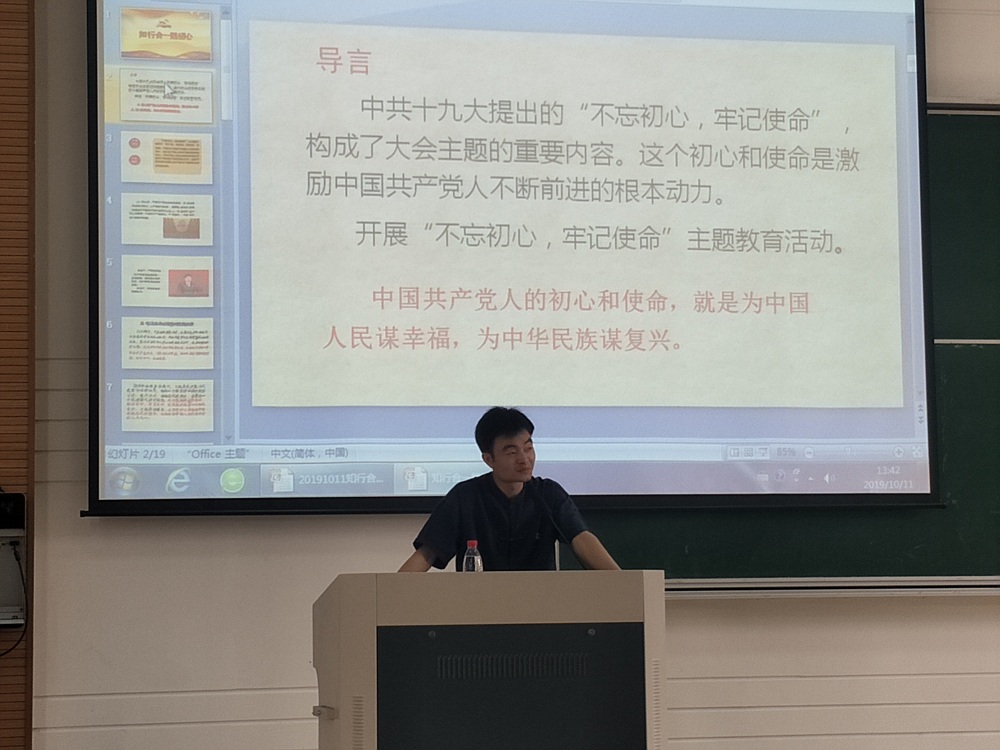 为持续深入开展“不忘初心 牢记使命”主题教育,10月11日下午,外国语公司党委联合计算机与数据工程公司党委邀请中共宁波市委党校文化和统战理论教研部副主任郭美星副教授在SB102教室以《知行合一践初心》为题为全体师生党员讲授了一场专题党课,受到了大家的热烈欢迎。