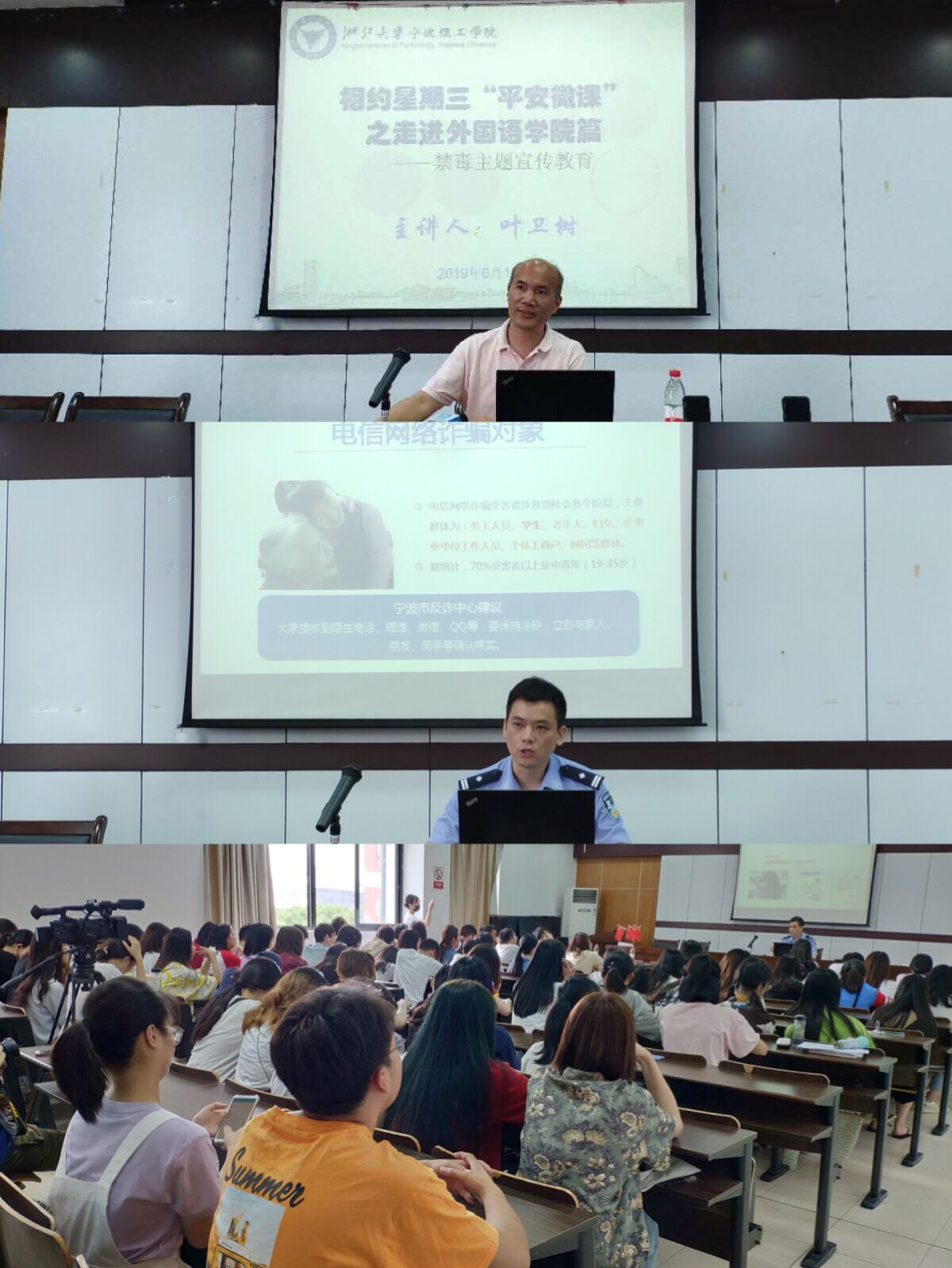 为了进一步提升广大师生防诈骗意识,提升高校思想政治工作的针对性、有效性,建设平安和谐校园,6月12日下午,由公司党委宣传部、保卫处和mk体育举办的“知行新说”第54讲暨“平安微课” 在SC405会议室举办。本次讲座的主题是禁毒与反诈,由公司保卫处副处长叶卫树和宁波市公安局刑侦支队中队长刘益主讲。