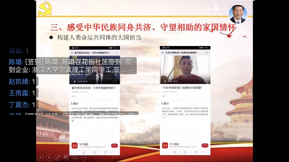 在王常青老师的带领下,全体员工党员学习了青年党员作为新生代力量在抗“疫”中的责任与担当,进一步感受到中国在构建全球命运共同体中所做出的中国贡献以及中华民族同舟共济、守望相助的家国情怀。网课结束后,全体党员围绕青年党员的时代使命和责任担当展开了讨论,员工第一党支部的汤菁妮同学谈到:“17年前非典发生的时候,全国团结起来保护我们90后,现在新冠肺炎爆发,我们90后都长大了,这次轮到我们90后青年站出来保护中国了。” 王老师在课堂中提及的习近平总书记给“90后”党员的一封信也是同学们讨论的热点。员工第二党支部的周蓉同学说,习近平总书记指出“人的一生只有一次青春。现在,青春是用来奋斗的;将来,青春是用来回忆的。”那么就让我们的青春在党和人民最需要的地方绽放绚丽之花吧。”