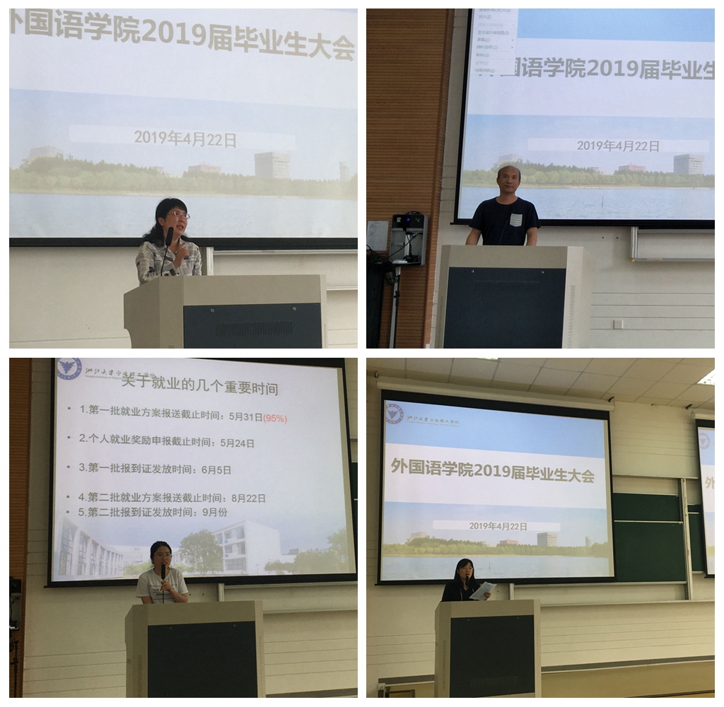 2019年4月22日下午1点30分,mk体育2019届毕业生大会在SB102教室隆重举行。出席本次会议的有外国语公司党委副书记傅晓宇、副经理周汶、保卫处副处长叶卫树、研究所所长助理欧琛、毕业班班导师以及2019届全体毕业生,会议由mk体育思政副主管刘杜娟老师主持。