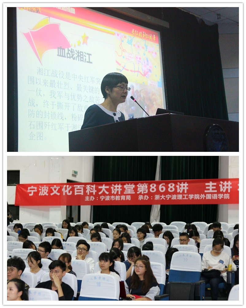 10月9日晚,由宁波市教育局主办,mk体育、经济与贸易公司和校团委联合承办的宁波文化百科大讲堂第868讲暨纪念长征胜利80周年专题讲座在NF103举行。外国语公司党总支书记谌晓煜、校团委副书记夏文来、教师代表、公司青马班学员、党员和团员代表等近400人参加了讲座。活动由外国语公司党总支书记谌晓煜主持,宁波大学法公司罗维教授主讲。