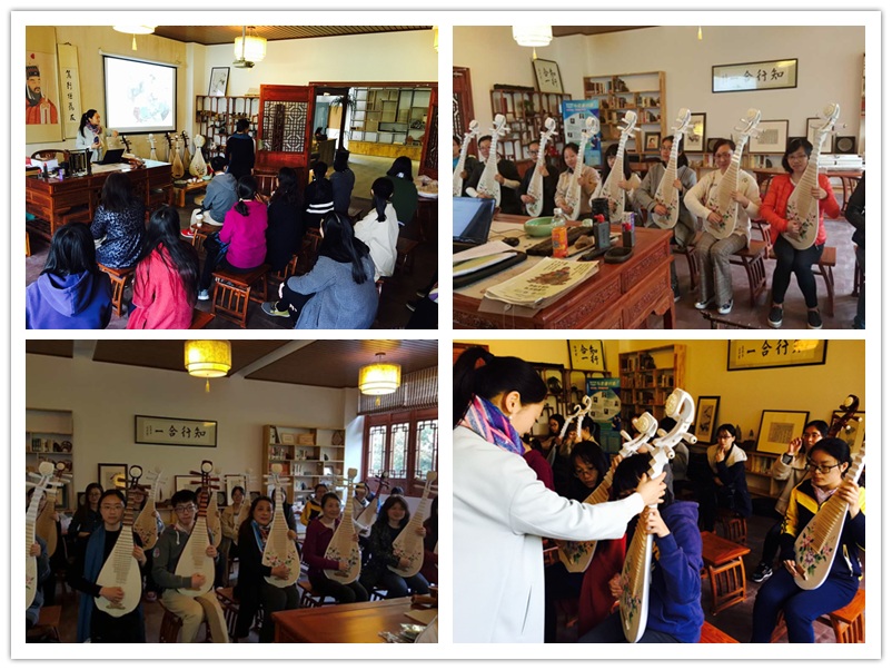 午后的阳明学堂阳光明媚,随园绿色入帘青,无限春光,精美的琵琶置于堂前,使整个阳明学堂更加的古朴、雅致。锦阳老师非常亲切,首先给大家介绍了琵琶的基本构造以及佩戴指甲的方法,让现场学员对这一中国传统乐器有了基本的认识。随后她又结合图片、琵琶演奏的优美音乐及视频,使学员们充分领略了极富中国人文传统的犹抱琵琶半遮面的含蓄之美、弹奏时形体的优雅之美。在听完琵琶名曲《琵琶语》,在场师生都为琵琶悱恻动听的音乐所打动,听老师说第二个学期大家就可以弹奏出此曲,同学们更是期待满满。课程最后,应老师为大家示范了基本的琵琶“拨”,“挑”指法,每个学员都练得非常认真。第一堂课在大家热情轻松的氛围里结束了。