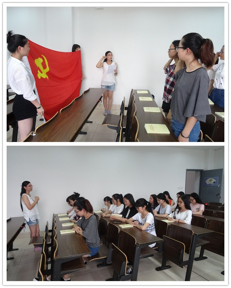 宣誓前,韩老师特地做了讲话:她为新党员介绍了目前“两学一做”的背景,并为每位新党员发放了《习近平总书记系列重要讲话读本》,韩晶晶老师希望新党员更加能够严格要求自己,重视理论学习和研究。韩老师对新发展党员提出了几点希望:第一,要加强科学文化知识的学习;第二,要在优良学风建设和文明校园建设活动中起积极的带头模范作用;第三,要思想重视,行动积极地投入到“两学一做”中来。