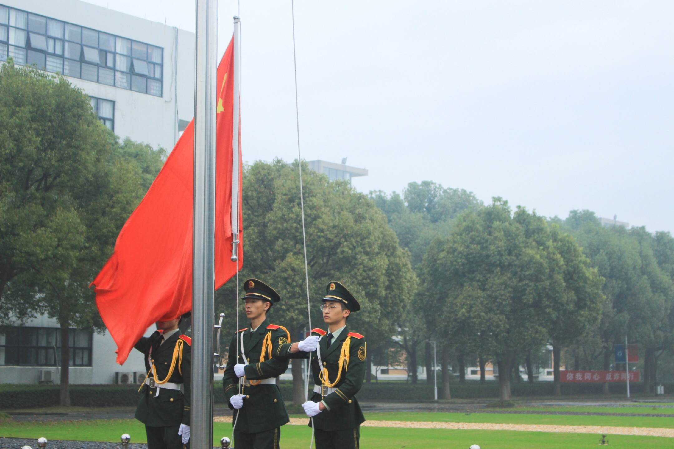 在简短的开场白后,主持人宣布升旗仪式正式开始。仪式第一项,升国旗奏国歌。伴随着响亮的口号声,浙江大学宁波理工公司国旗护卫队踏着整齐的步伐走到国旗台前,步调一致,整齐划一。伴随着国歌奏响,五星红旗在旗杆上冉冉升起,全体师生行注目礼,最终在国歌结束的那一刹那,五星红旗在旗杆的最顶端定格,随风飘扬。整个升旗过程,每位同学都目不转睛地注视着五星红旗,认真对待仪式,彰显了mk体育学子良好的精神风貌。