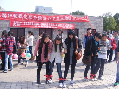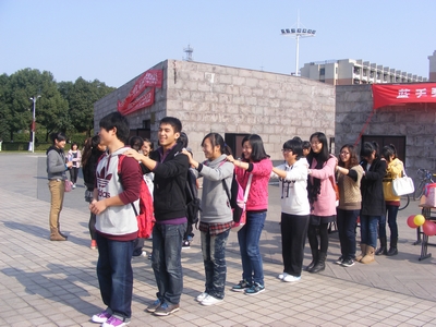 11月25日中午在随园成功开展了户外活动,外语学子热情参与,引起了不少来往行人的关注。内容包括绑蓝丝带,索拥抱,盲人过路,“找零钱”,“有错你就说”,“寻人行动”,“萝卜蹲”,“你比划我来猜”和两人三足9个有趣且富有意义的活动。同学们用生动形象地肢体语言和准确的口头描述,演绎着一个个角色,体现了队友间的相互配合。“萝卜蹲”活动更是活跃了现场气氛,考验了同学们的灵敏程度。各色各样的户外活动加强同学们的合作与信任,对陌生人的关爱和友好,树立一个正确积极的阳光心态。