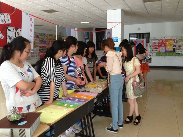 大厅内,悬挂着一张张制作精美的海报,展桌上,摆放着琳琅满目的艺术作品。有布艺创意组的零钱包,有手工珠宝创意组的精美手链,有热缩片创意组的精美挂片,还有盆栽创意组的可爱植物。 来来往往的同学们被一件件作品深深的吸引了,纷纷停下来脚步。外院男生亲手制作的串珠手链显得特别的畅销,同学们有的戴戴彩色手链,有的试试骨头手链,作品的主人们在一旁热情的介绍着,并向同学们讲解着每条手链所特有的涵义。手工缝制的卡套和布艺零钱包,因为其可爱精美的外形,新颖的创意,也深受同学们的喜爱。因在场展出的作品不够,还接受了同学们的预定,并承诺送货上门。热缩片创意组和植物盆栽组的作品,体现着作品主人们奇特的创意。利用热缩片的神奇原理印出的图案和文字,各不相同。那一盆盆手工制作的植物也在阳光下显得生机勃勃。