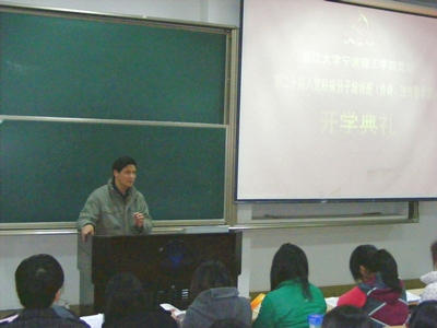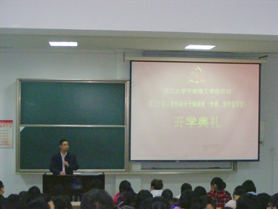 2011年3月29日晚,SF205教室座无虚席,气氛庄重,公司党校第二十期入党积极分子培训班外语法传教学班开学典礼在这里举行。外语分公司党总支书记谌晓煜、外语分公司党总支兼职组织员盛育冬、法传分院团委书记梁长海以及外语分院团委书记李炜、团委副书记陈印昌等老师出席。来自外语、法传两个分院的123位学员参加了开学典礼。