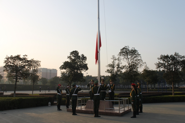在初升的太阳下,公司国旗护卫队迈着铿锵有力的步伐走向升旗台,庄严有序的做好升旗前的准备工作。鲜艳的五星红旗在雄伟的国歌声中冉冉升起,全体大一同学一齐向国旗行注目礼,并高唱国歌。