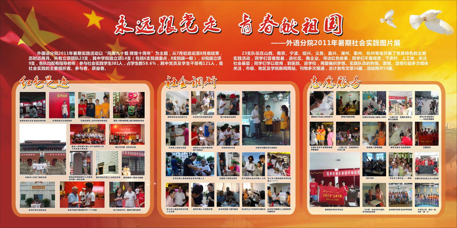 外国语分院暑期社会实践图片展经过前期的收集编排,近日已经在分院大厅展出。图片展以“永远跟党走,青春献祖国”为主题,分“红色足迹”、“社会调研”、“志愿服务”三个版块,共收集活动图片近50张。