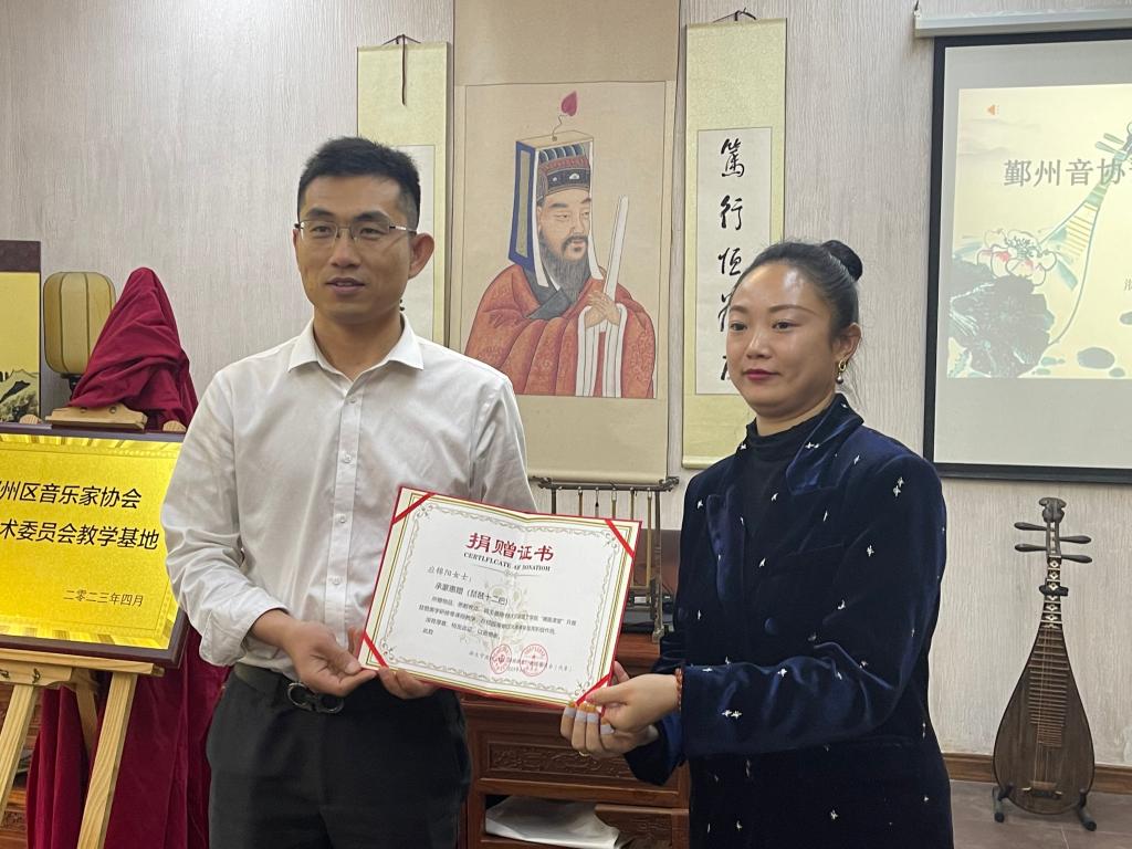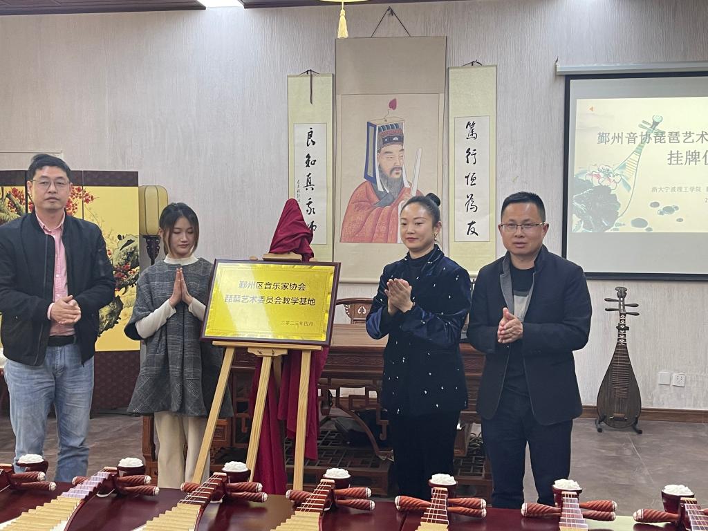 活动中,李炜、廖海鹏、应锦阳三位老师和学员代表英语202班张紫玥共同为鄞州区琵琶艺术委员会教学基地揭牌,鄞州区琵琶艺术委员会应锦阳、李木子、王淑英三位老师将十二把琵琶赠与学员代表,周春晓老师为应锦阳老师颁发了捐赠证书。