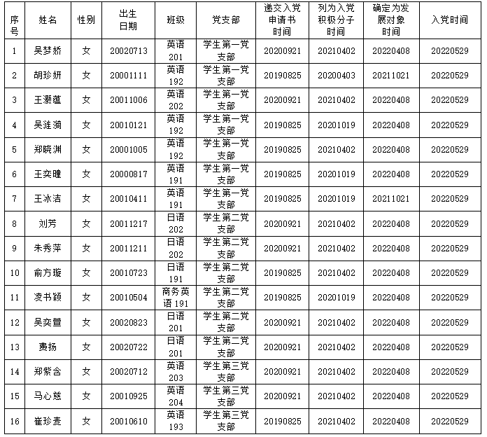 根据吴梦娇等16名同志的现实表现和党组织的培养考察,经本人申请、支委会审查,拟将吴梦娇等16名同志按期转为正式党员。为进一步增强发展党员工作的透明度,接受党内外群众的监督,确保发展新党员的质量,现予以公示。在公示期限内,欢迎广大师生通过信函、电话或直接反映问题。以个人名义信函反映提倡署真实姓名。公示7天,时间自2023年5月23日至2023年5月29日。