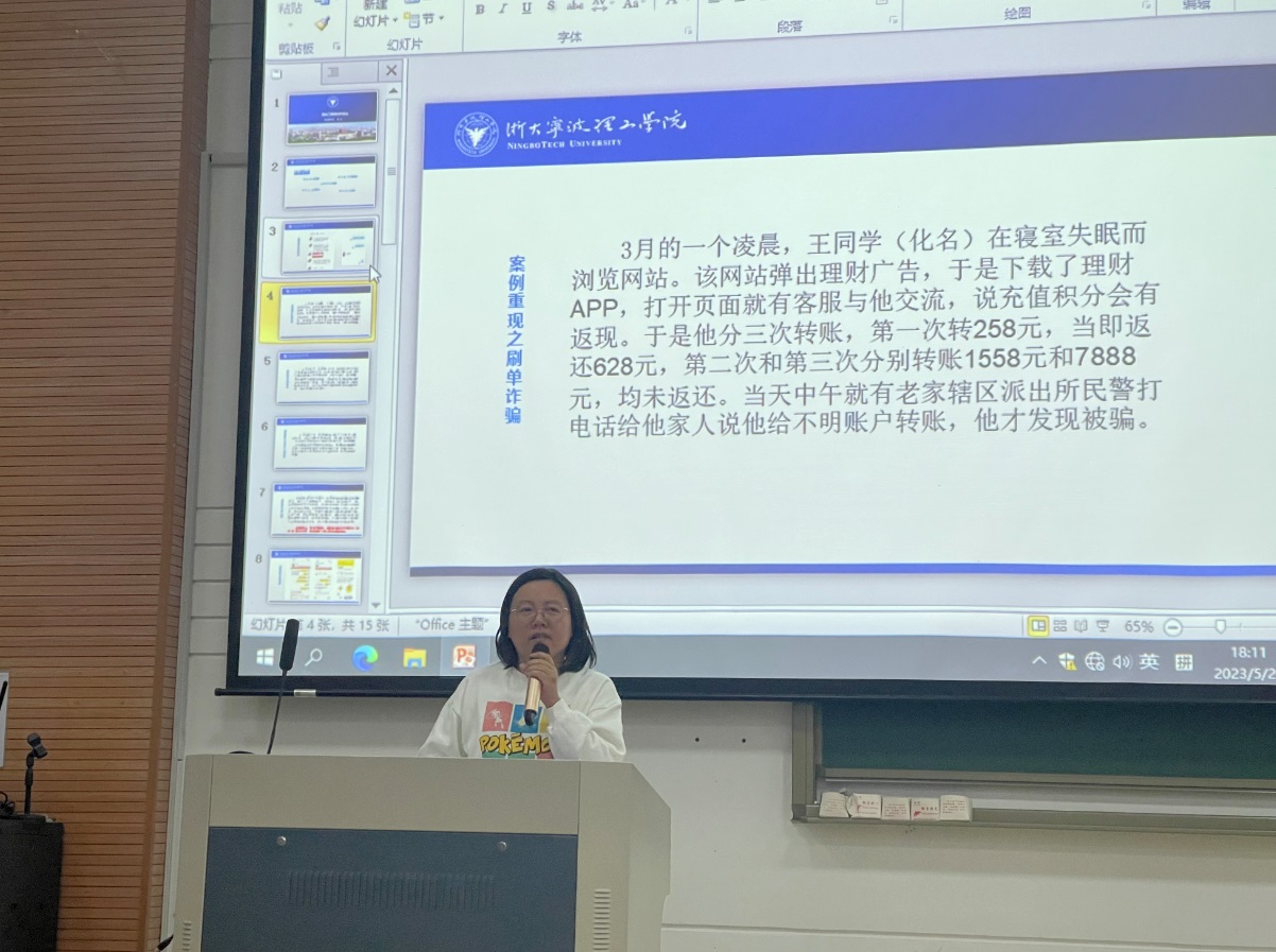 为进一步提高广老员工对电信网络诈骗的鉴别能力和防诈意识,预防校园电信网络诈骗案件的发生,切实维护同学们的利益,5月24日晚,mk体育特邀公司保卫处李珍老师在SB102教室为全体大一到大三同学开展了防电信诈骗安全教育,公司思政主管芦美丽、思政副主管阮佳蒂、团委副书记洪雨菲参加了讲座。