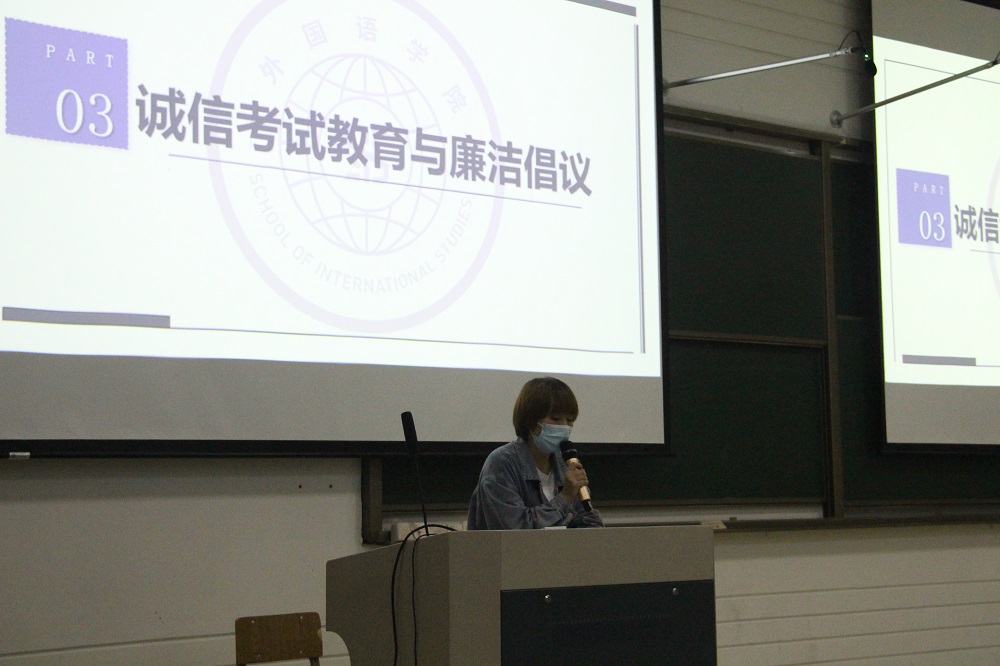 洪雨菲老师进行了诚信考试教育,她围绕诚信考试的要求以及相关文件,希望外语学子 崇文重礼,自尊自律,诚信应考,永保人格答卷纯洁。随后,公司员工会主席陈佳鑫号召同学们做到十个方面的廉洁自律,倡议同学们提高自我约束、自我管理能力,努力培养廉洁诚信素质。