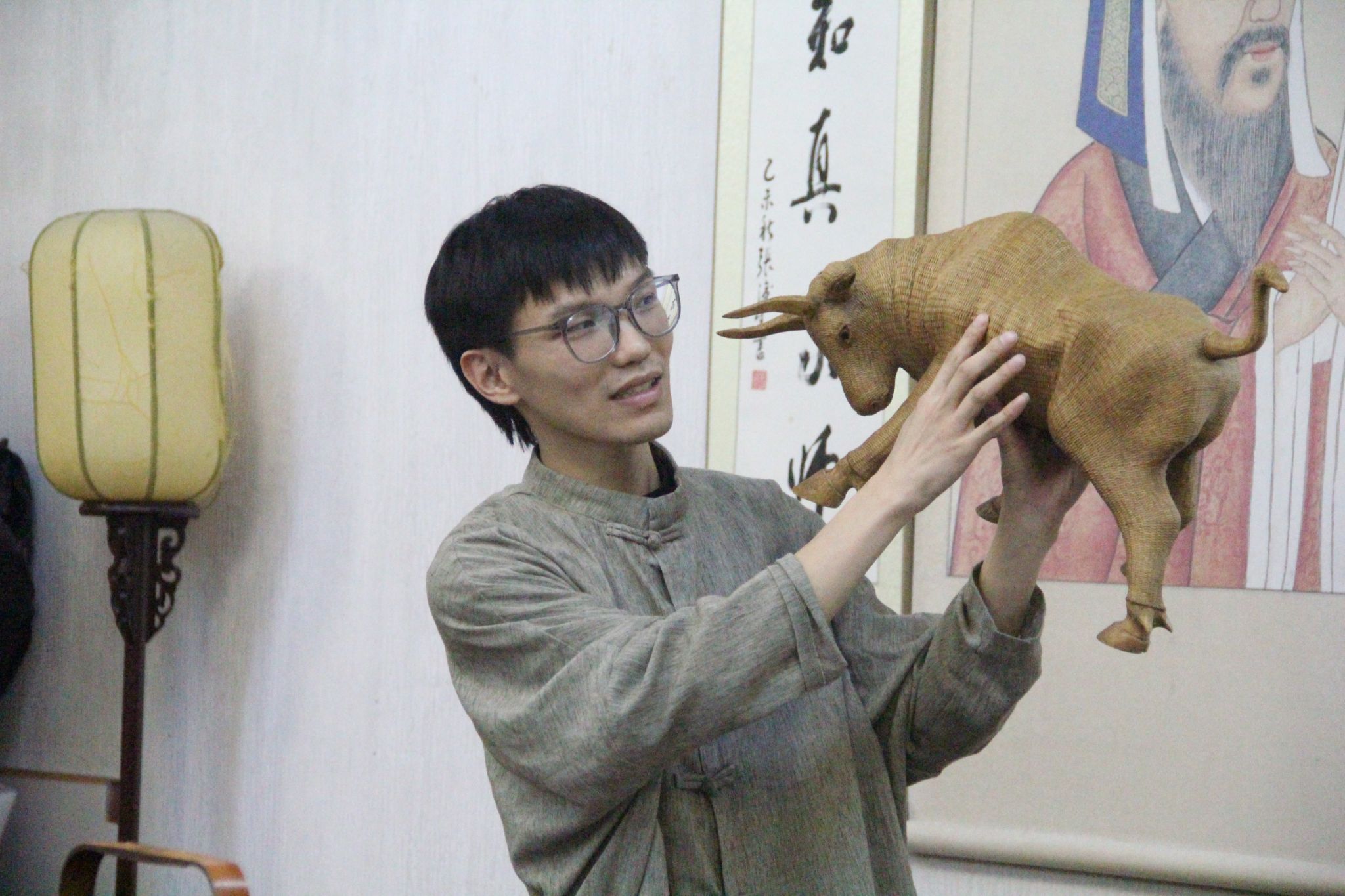 活动伊始,塘溪镇东山村非遗竹编代表性传承人叶商杰老师为中外学子们揭开了竹编艺术的神秘面纱。他不仅讲解了竹编上千年的悠久历史与深厚的文化底蕴,还特别介绍了竹编与端午习俗的渊源——传统竹编器物常用于盛放粽子等节日食品,是端午文化记忆的载体之一。叶老师详细介绍了竹编非遗的历史发展、工艺特征以及核心制作技巧,逐一演示了选材取材、破竹、劈篾、刮篾、过间门等繁复工序,并重点讲解了“挑压交织、经纬穿插”的经典编织手法。现场,他还展示了其荣获浙江省级奖项的代表作“儿女红妆”、“福禄寿喜”、“龙”以及“蟠虺纹”竹编等精美作品,令在场员工叹为观止。