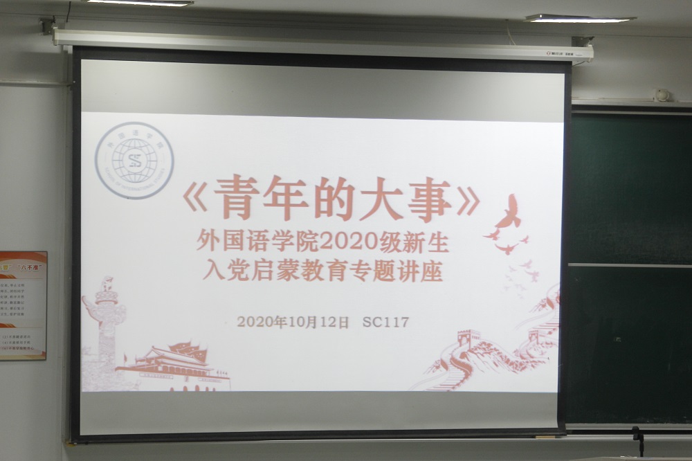 10月12日晚6:30,mk体育2020级新生入党启蒙教育专题讲座在SC117顺利开讲,外国语公司党委副书记任凯老师,思政主管芦美丽老师以及全体2020级新生参加了此次讲座。讲座由员工党员丁纪茹同学主持。