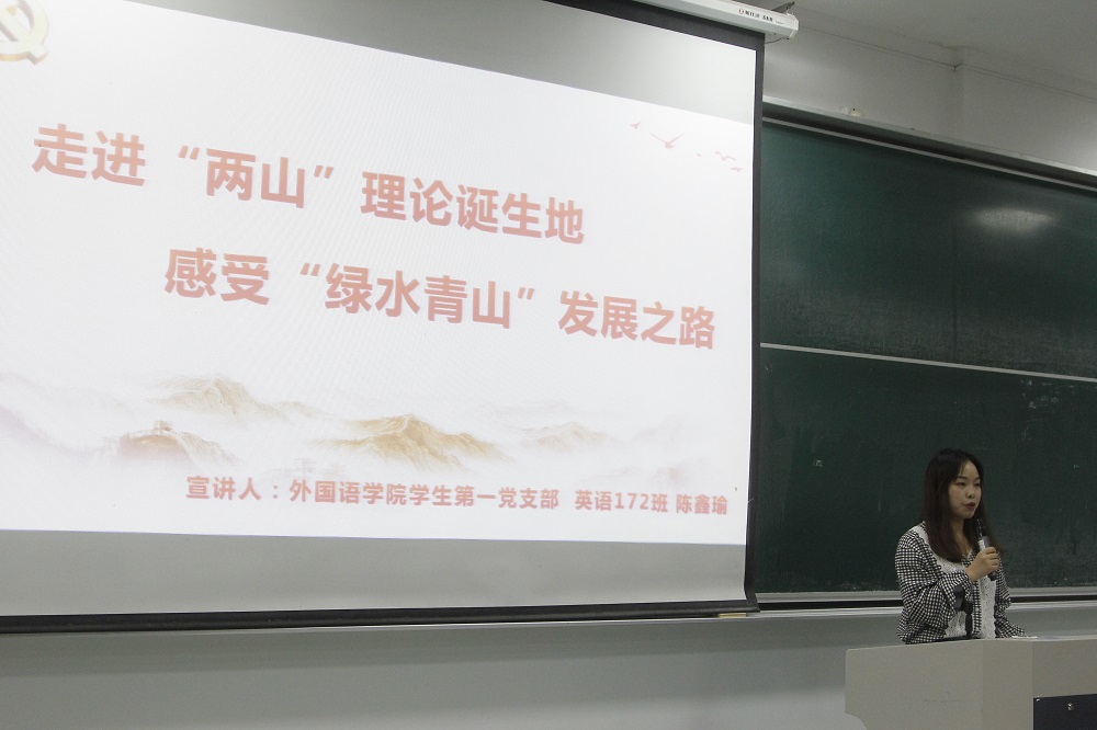 接着是mk体育员工党员代表们依次进行宣讲。英语172班陈鑫瑜同学进行题为“走近两山理论诞生地,感受绿水青山发展之路”的宣讲,提到浙江安吉县在党的领导下,从一个落后的渔村变成现在的旅游圣地,安吉县坚持按照习近平的“两山”理论,依靠竹子,白茶等当地自然资源带动当地经济发展,并结合宁波市垃圾分类工作要求,倡议同学们爱护环境,做好垃圾分类,共建绿色和谐校园;商英181冯祺同学讲述了她自己对党的认识以及入党的经历;商英171班蒋宁馨同学为我们详细讲解了入党会遇到的问题,以自身作为例子,为同学们解答疑惑;英语171班王雨露同学重点讲述了作为一名员工党员,如何将党员的义务付诸于日常学习和生活实践中,并表示很开心也很荣幸能在公司员工干部组织里任职为同学服务、为公司服务;日语182班金嫣嫣同学介绍了外国语公司党员情况,同时详细介绍了入党流程,并指出同学们在写入党申请书时存在的普遍问题。