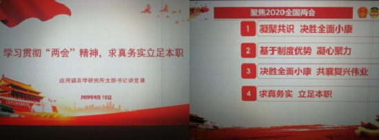 为深入学习领会“两会”精神,更好立足本职工作,6月18日中午,mk体育应用语言研究所教工党支部在钉钉直播上进行主题为“学习贯彻‘两会’精神,求真务实立足本职”的党课学习。除了一名不在国内因时差关系计划收看回播的教师外,该支部其他党员教师均准时在线参加。党课主讲人为支部书记周先武老师,活动由支部宣传委员邓丽静老师主持,