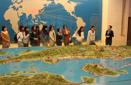 公司师生参观考察的第一站是宁波国际航运服务中心。刚走进中心大门,大家就被中心大气的现代化建设风格所吸引了。在相关负责人的带领下,大家对中心进行了简单的参观,并结合他们的解说,对宁波的航运历史、中心的工作体系和流程有了一定的了解。据介绍,航运中心是以进一步培育和完善宁波航运市场体系,提升宁波现代服务发展水平,加强大通关、电子口岸和第四方物流体系建设,提高通关效率,降低物流成本为目标建立的,现在的中心也正朝着这个目标不断发展和进步中。