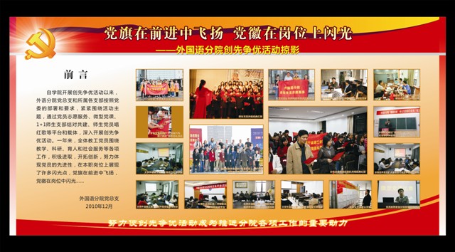 自公司开展创先争优活动以来,外语分公司党总支和所属各支部按照党委的部署和要求,紧紧围绕活动主题,通过党员志愿服务、微型党课、1+1师生支部结对共建、师生党员唱红歌等平台和载体,深入开展创先争优活动。一年来,全体教工党员围绕教学、科研、育人和社会服务等各项工作,积极进取,开拓创新,努力体现党员的先进性,在本职岗位上展现了许多闪光点。为展示分院教师党员风采,表彰先进集体和个人,外国语分公司党总支举办了“党旗在前进中飞扬,党徽在岗位上闪光”--2010年外国语分院教师党员风采展。