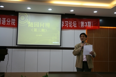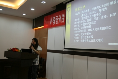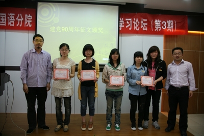 “有中国共产党在,不怕没盐吃!”随着一句句诙谐幽默又发人深省的演讲词,一次形式新颖的微型党课进入高潮。 这就是4月28日下午在SC405开展的外国语分院第三届“随园问辨”员工党员微型党课暨建党90周年征文颁奖典礼。本次“随园问辨”以“我和党的故事”为主题,各位员工党员以自叙的方式讲解“我和党的故事”。外语分公司党总支书记谌晓煜、分院思政主管方芳、分院思政副主管李炜和团委副书记陈印昌等老师也参加了活动。 活动伊始是“分院建党九十周年征文”颁奖仪式。谌晓煜老师认为通过征文表现出广大同学的创造力,体现了现在党员对中国共产党的热爱和支持。 随后微型党课正式拉开帷幕。胡慧中、李欢欢、徐航远等6位预备党员代表从不同的角度切入话题,进行了精彩的演讲。党员们分别从党的历史、党史上的今天、当前国际形势下的党、我心中的党和抢盐问题中的党等方面做了精彩而全面的论述,并针对话题或问题提出了自己的见解和思考。 这次特别的微型党课教育,为党员们提供了一个学习时事党政的平台和交流感受的机会,所有到场党员提高了党性修养和政治理论水平,并表示希望在以后的生活中起更积极的带头作用,严格要求自己,在面对问题时勤于思考,争做一名思想合格、行动奉献的党员。