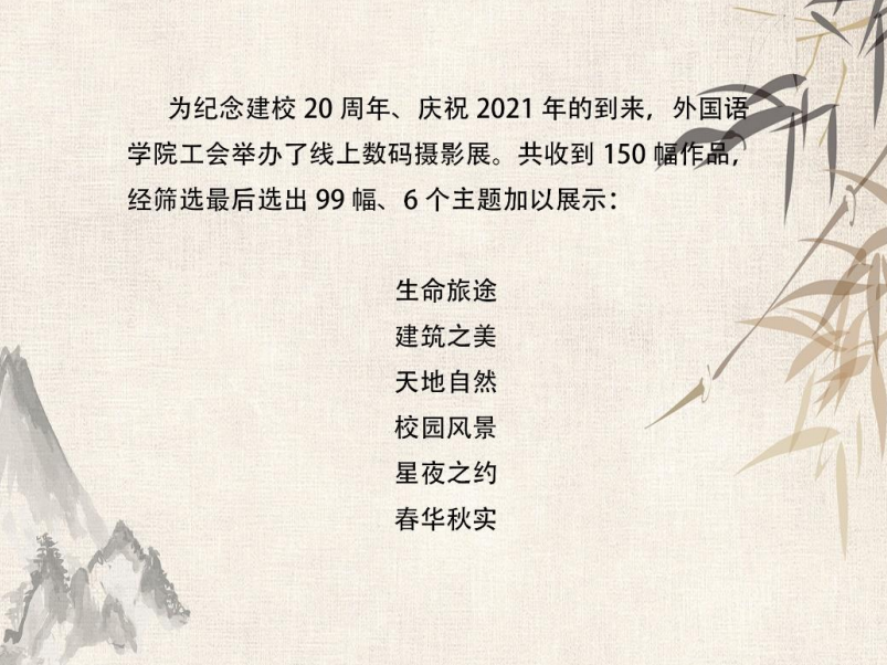 本次影展共收到公司职工精心选送的一百五十多件摄影作品,最后筛选出九十九件,通过整理、归类,分成生命旅途、建筑之美、天地自然、校园风景、春华秋实、星夜之约六大主题,并制作成精美的电子影集和视频。活动中,公司职工踊跃参加,积极投稿。老师们从不同视角捕捉身边的美,表现出对人生、自然、环境的观察力、理解力,也展露出可喜的艺术表达能力和鉴赏能力。