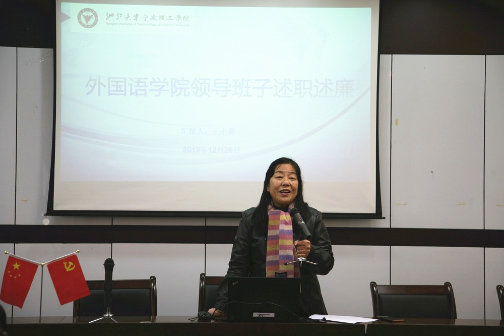 首先由王小潞经理作了2019年mk体育领导班子述职述廉工作报告。她回顾了过去一年里公司领导班子在廉政建设、教学与科研、团队队伍建设、教育国际化、员工实践和特色平台等方面所取得的成绩。同时,分析了公司在团队队伍建设、教学科研能力提升,大学英语教学改革,科研团队培育和员工素质教育等五方面存在着不足,并提出了今后努力改进的方向与办法。随后王小潞经理、傅晓宇书记、蔡亮副经理、周汶副经理和任凯副书记分别就个人分管的工作进行了述职述廉汇报。