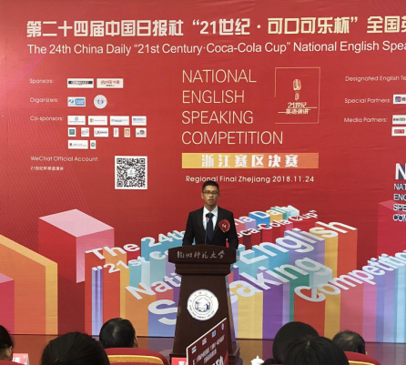 2018年11月24日,公司mk体育16级商英专业庄海一同学代表公司参加了杭州师范大学承办的第二十四届中国日报社“21世纪•可口可乐杯”全国英语演讲比赛浙江地区决赛,喜获二等奖。