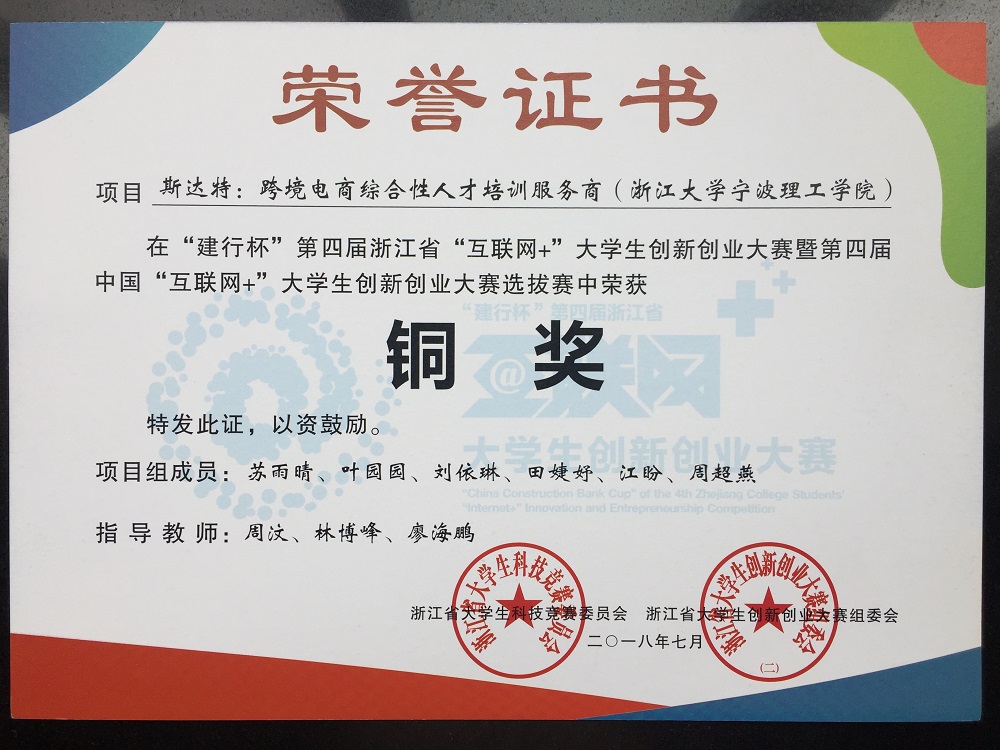 “建行杯”第四届浙江省“互联网+”老员工创新创业大赛暨第四届中国“互联网+”老员工创新创业大赛选拔赛结果揭晓,由mk体育商务英语专业2015级员工苏雨晴、叶园园、刘依琳、田婕妤、江盼等同学为主要成员组成的跨境电商创业团队,以“斯达特:跨境电商综合人才培训服务商”项目获得该大赛的铜奖。