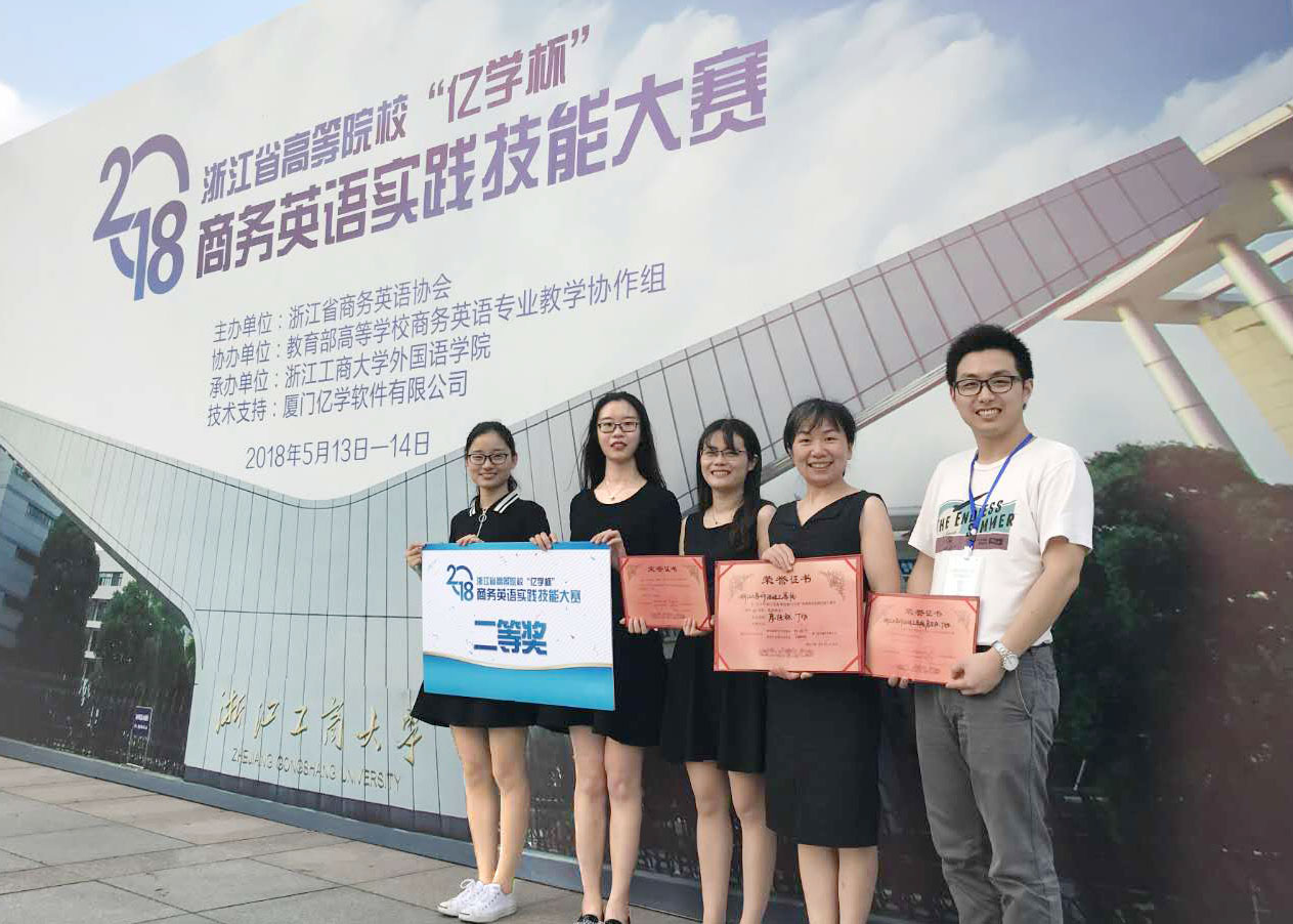 5月14日,由浙江省商务英语协会主办,教育部高等公司商务英语专业教学协作组协办的2018浙江省高等院校“亿学杯”商务英语实践技能大赛在浙江工商大学隆重举行。在公司mk体育廖佳栋老师和丁旭老师的指导下,由mk体育的叶园园、苏雨晴、刘依琳组成的队伍经历激烈的角逐,获得了团体二等奖,总分排名第五的好成绩,离一等奖仅一步之遥。
