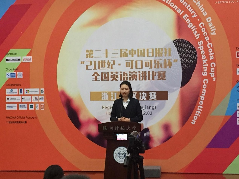 2017年12月1日至2日,公司mk体育15级英语专业杨舒婷同学代表公司参加了杭州师范大学承办的第二十三届中国日报社“21世纪•可口可乐杯”全国英语演讲比赛浙江地区决赛,获得佳绩,荣获一等奖。