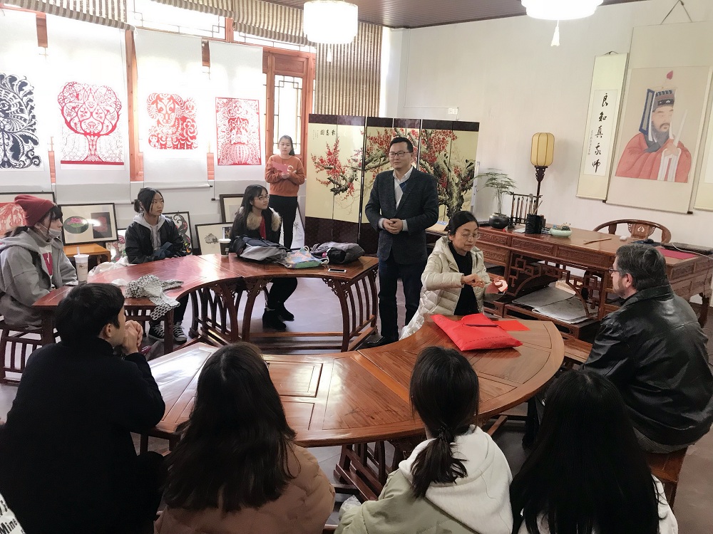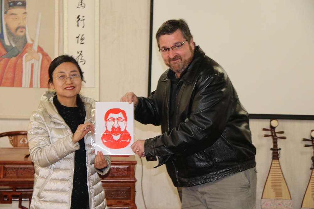 12月6日中午,开展仪式在阳明学堂举行。中国民间文艺家协会会员、甘肃省民间文艺家协会理事何霞女士,mk体育副经理蔡亮、mk体育外教John、mk体育团委书记芦美丽和20余名员工出席了仪式。主展人何霞老师和mk体育副经理蔡亮老师分别致辞发言。仪式上,何霞老师用五分钟的时间为外教John现场剪了一副肖像画,咔咔咔几剪刀,John的剪纸肖像就生动的展现了出来,神性兼具,现场师生被何老师高超的剪纸技术深深折服,惊叹不已。