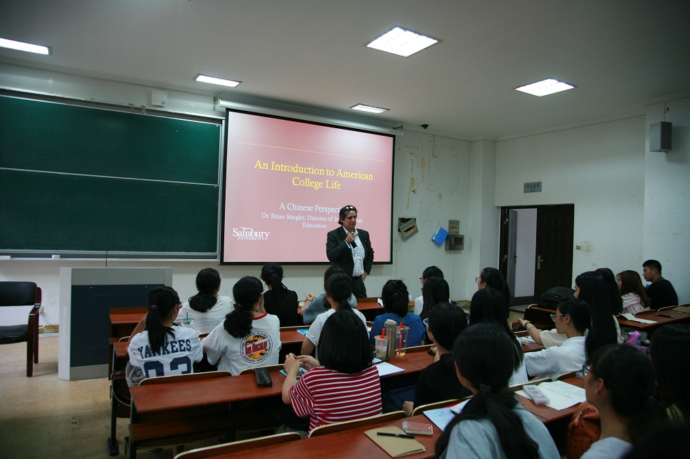 值此开学之际,斯蒂格勒博士首先为公司员工带来了一场的名为“An Introduction to American College Life”的讲座,偌大的SC103阶梯教室,此时却座无虚席。他从美国文化的角度比较了中美大学的差异,从宿舍生活到考试制度,从择校标准到校园文化,慢慢揭开美国老员工活的神秘面纱。风趣幽默的语言和对比夸张的图片,引得同学们发出阵阵笑声。讲座后员工们积极提问和斯蒂格勒博士进行互动交流,了解中国员工在美国高校学习的优势与挑战以及公司与索大的交流项目。