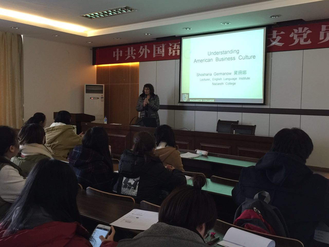 会谈后,Shoshana老师为师生们带来了《康奈尔笔记法:助你学业成功》和《美国商业文化探寻》两场专题讲座,并与同学们进行了热烈的互动,回答了同学们提出的相关问题。另外28日晚上,在NF103举行的mk体育的海外学习交流大会上,Shoshana老师上台介绍了拿撒勒大学的短期和长期学习项目,受到了同学们的关注和欢迎,把海外学习交流的氛围推向了新高。