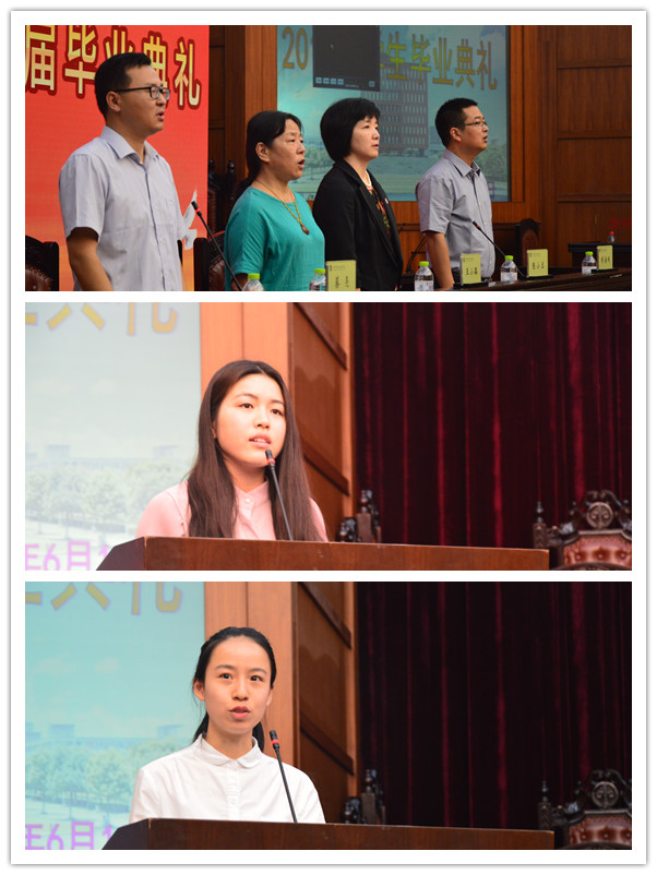 在发言席上,公司王小璐经理用全英文向全体毕业班同学致辞,她希望同学们永怀感恩之心,走出校园后在新的岗位上继续奋发努力,在未来的人生道路上飞得更高,走得更远;教师代表李飒老师用“仰望星空,脚踏实地”作为临别赠言,她希望所有的外语学子有时间还能来随园读读外语,在阳明学堂谈谈文化,喝喝咖啡,一切恍若昨日,一切充满希望;英语125班的李新新同学作为毕业生代表,在离别致辞中回顾了大学四年的生活,勉励学弟学妹们坚持奋发图强,学好外语并表达了对母校的感激和祝福;商英131班的章丽琼同学作为在校生代表向即将离开母校的学长学姐们表达最真诚的祝愿,祝福学长学姐工作顺利,记得常回理工看看,常回家看看。