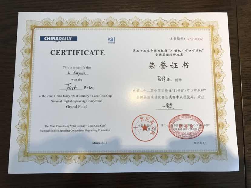厉修远同学非常感谢公司给予的培养和机会让其在更大的平台上展现对英语的喜爱和热情,在大学的学习中参与了多次英语演讲与辩论的赛事,。其曾获得过宁波理工公司校内演讲比赛一二三等奖,外研社英语演讲比赛浙江省决赛三等奖,21世纪英语演讲比赛浙江省决赛三等奖、21世纪英语演讲比赛浙江省决赛特等奖(晋级全国赛),在这次的比赛中,他获得了21世纪英语演讲比赛全国总决赛一等奖的好成绩。